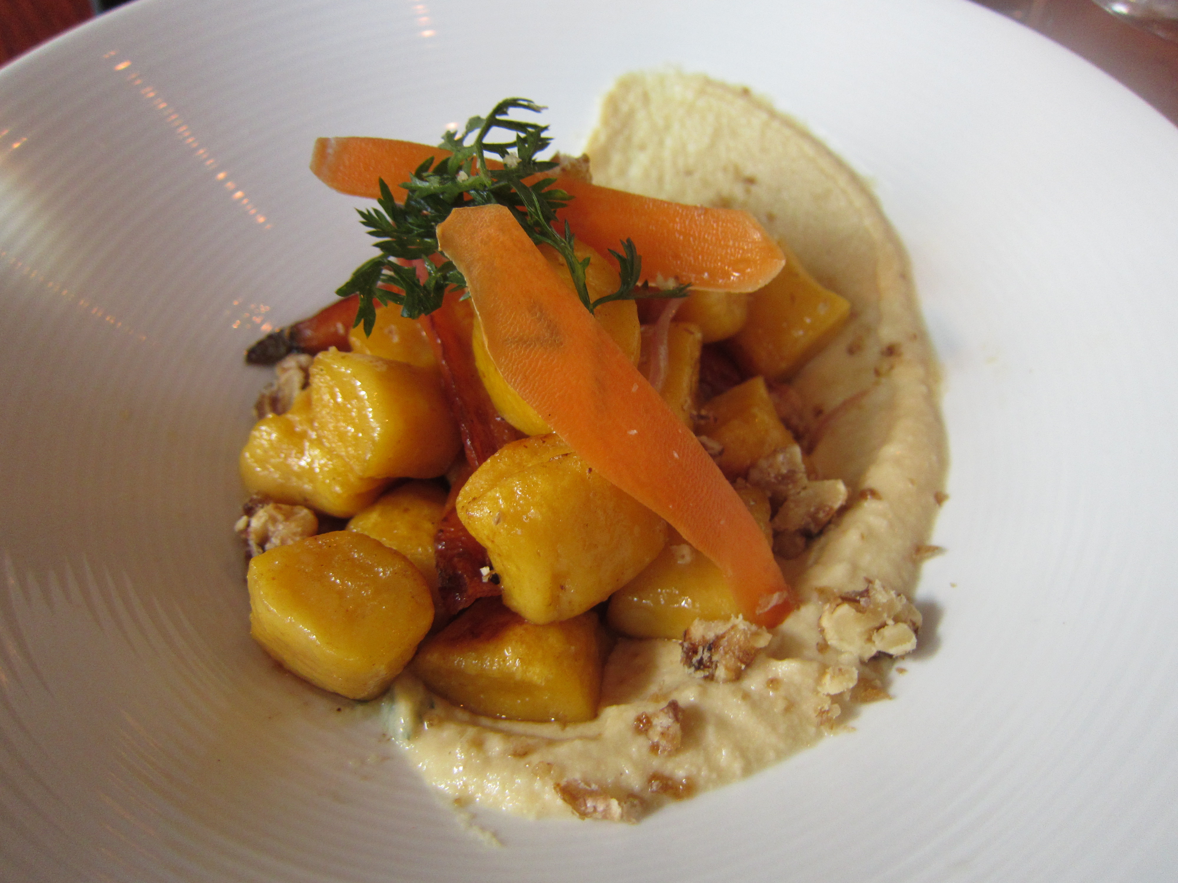 Out next was a delightfully chewy, egg-heavy baby carrot gnocchi, tossed in brown butter and served with shaved roasted carrot atop a simple hummus. The dish was light, refreshing and well prepared, but more or less forgettable.