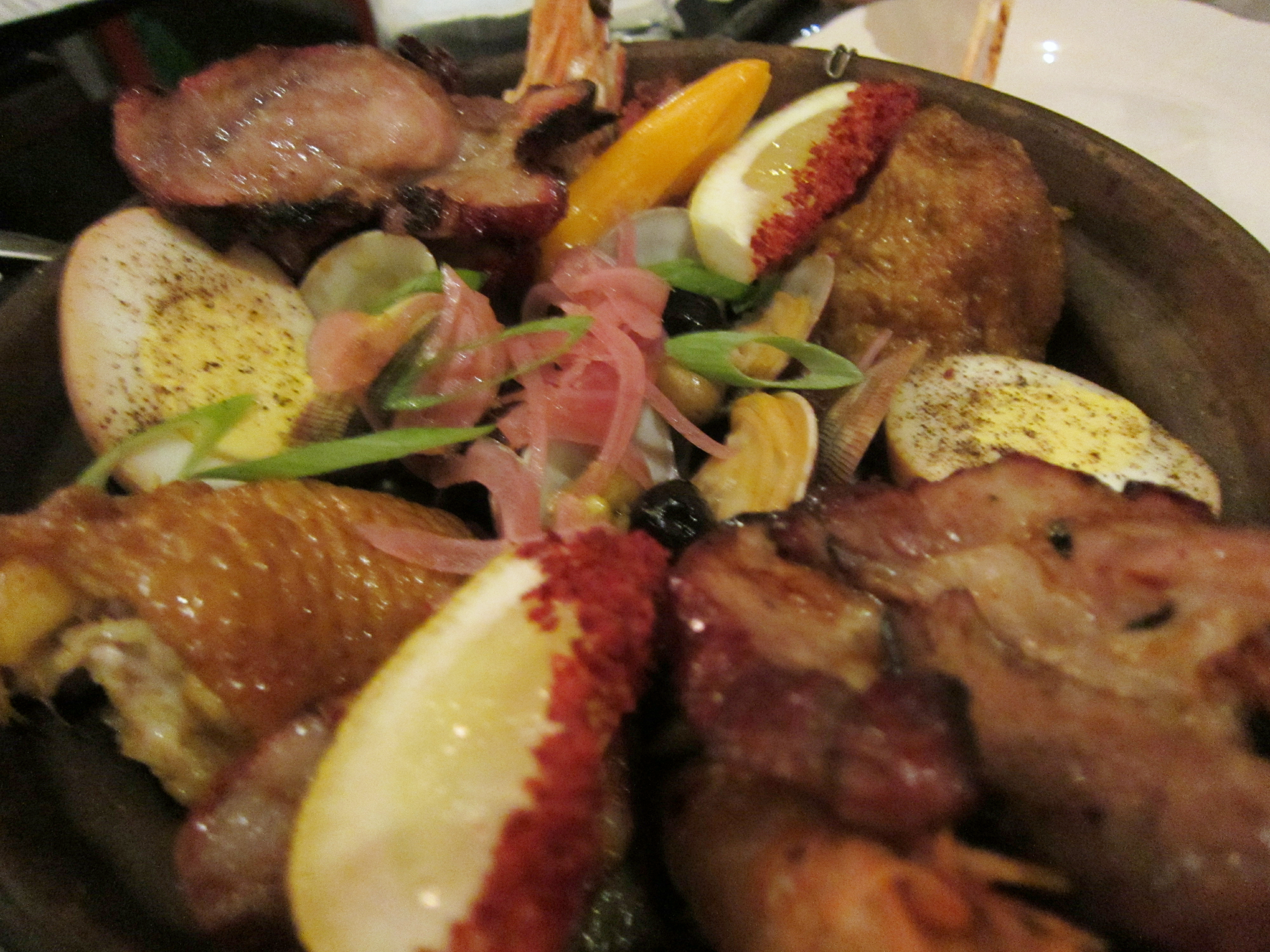 Next came our arroz gordo–the house’s signature fat rice. The dish is storied for its elaborate preparation in earthenware. First, the earthenware is soaked in water over night, then the inside coated in oil. Sofrito-scented rice, lap cheong, green grapes, assorted cured olives, various pickled hot peppers and a litany of seasonings are added and slow cooked. During the course of slow cooking, the rice richly caramelizes and proteins are added and finished with the rice. These proteins impressively include Chinese barbecued pork and duck, a classic Portuguese smoked pork sausage called linguiça, whole prawns, whole littleneck clams, Portuguese-style braised chicken and tea eggs (a hardboiled egg finished in green tea, in this case). The dish was finished with pickled vegetables, fresh greens and lemon wedges coated in chili seasoning. On the side was also a shiitake soy sauce, cilantro, fresh sliced jalapeño peppers and a “ghost pepper-habanero hot sauce” which we combined to taste with our rice. The presentation was impressive to say the least and the flavor of the rice was excellent combining sweet, heat and savory in a single dish. The proteins included in cooking gave the rice a robust umami flavor that was delightful. Nonetheless, we were slightly underwhelmed. The dish seemed insufficiently refined for a two hour wait and a $42 price tag. This was nothing much more than slightly refined peasant cuisine, in other words.