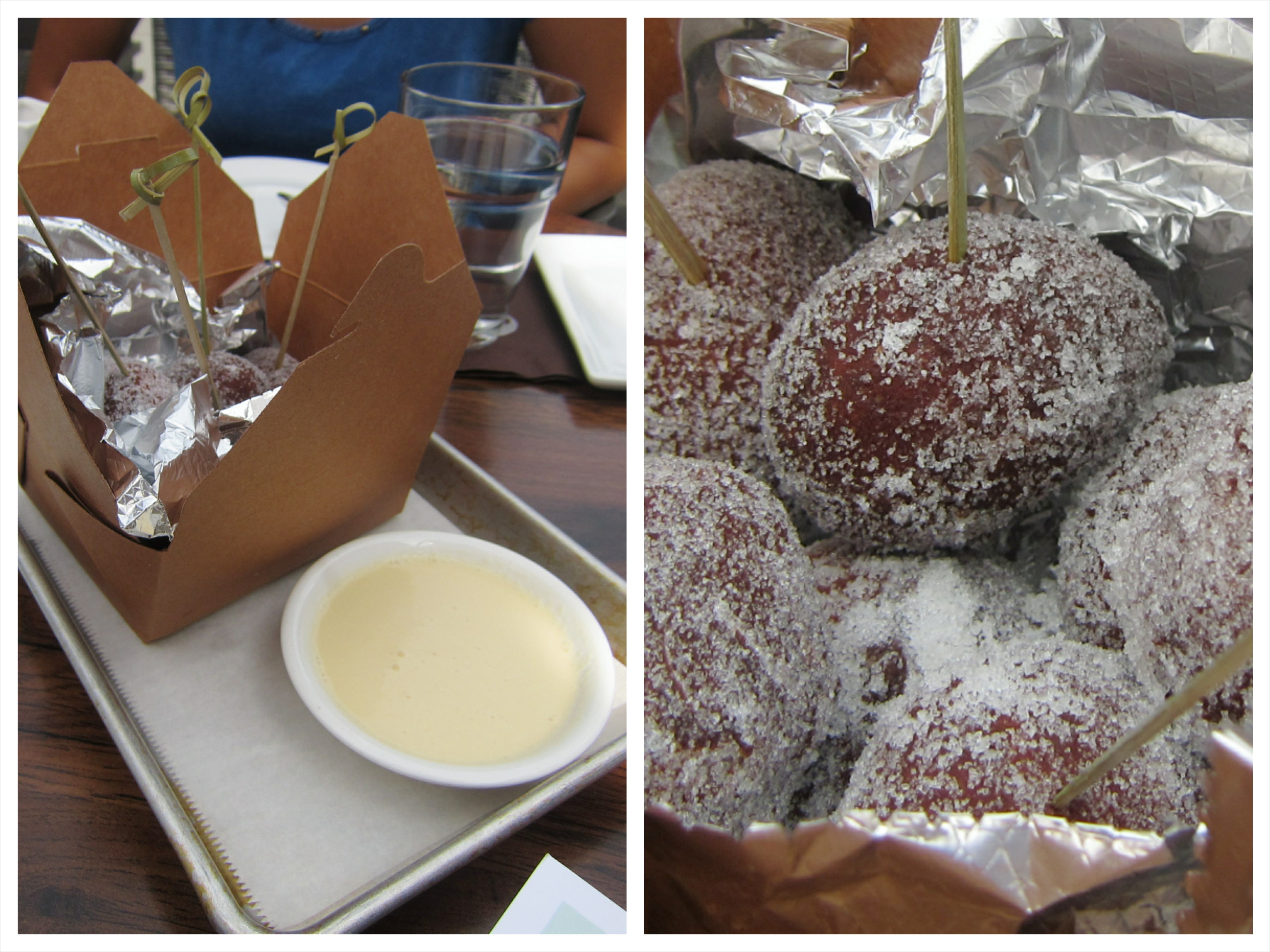 Among the highlights are the malasadas–something a kin to a doughnut hole, originating from Portugal but ubiquitous among the Hawaiian islands–which are a heavy consistency, but still soft and pleasing. The malasadas are coated in sugar, and served with what the house calls “citrus crème anglaise” for dipping. The crème anglaise was curious in that it was neither citrusy nor crème anglaise. It had the consistency of whole milk but with slightly less richness and no citrus flavor to speak of. As a result, it was extremely unsatisfying to attempt to coat the malasadas in what I’ll call the dipping sauce–most of it just dribbled off. The presentation, however, was playful with a to-go container lined with foil, a reference to the numerous Hawaiian bakeries that serve the treats in exactly that manner.