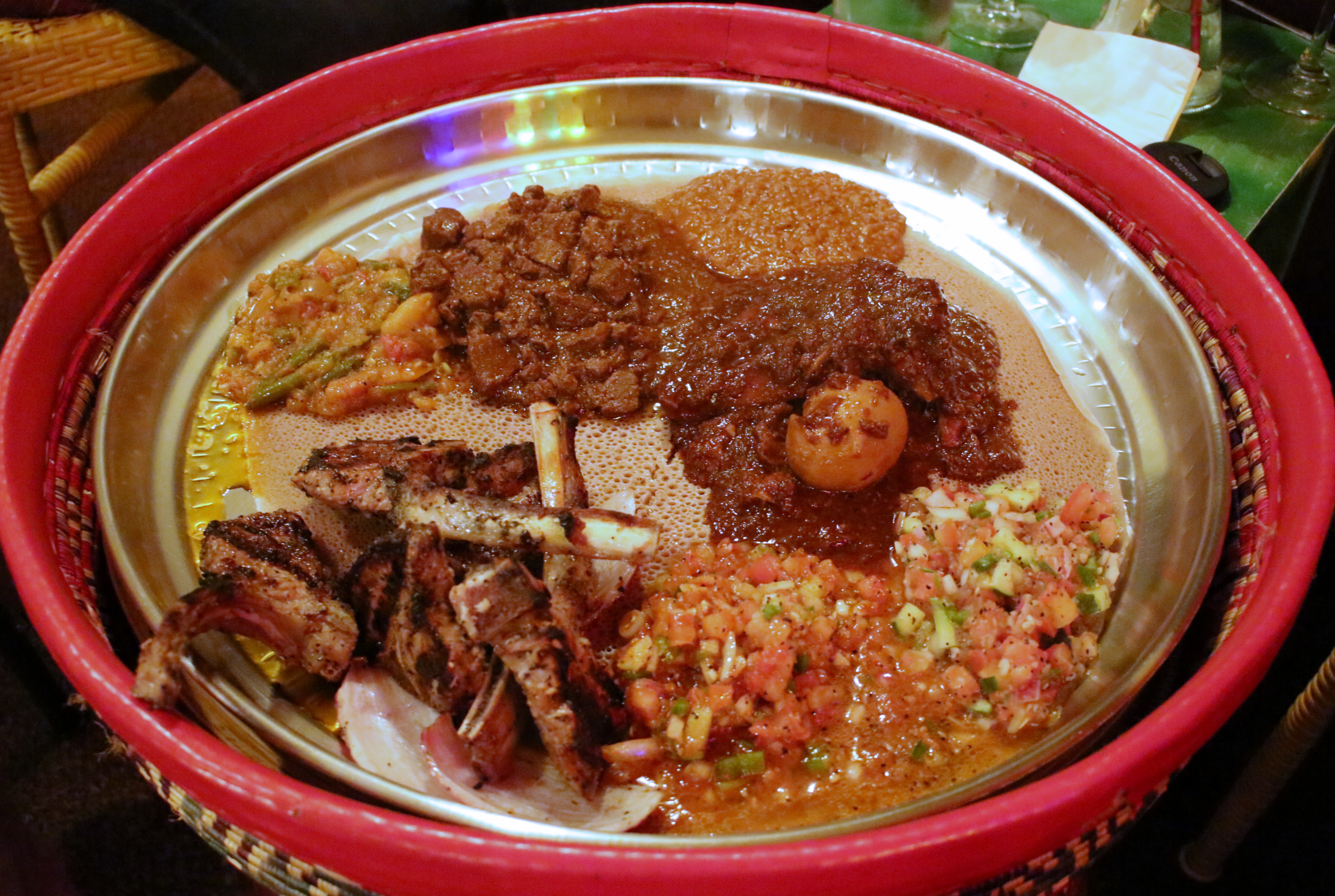 Next, Ethiopian traditional stew, called wat, are a staple of the mesob. Most wats are made very similarly using the same technique and often the same spices, with the only variation generally being the protein and some vegetables. The spice used is generally a blend known as berbere–which has some heat to it due to the inclusion of chili powder–or straight turmeric for the milder wats. Tibs are the other staple, which are essentially a spiced meat and vegetable, generally sautéd but sometimes grilled. The meat–usually beef or lamb–usually comes out medium-rare to medium and beautifully browned.