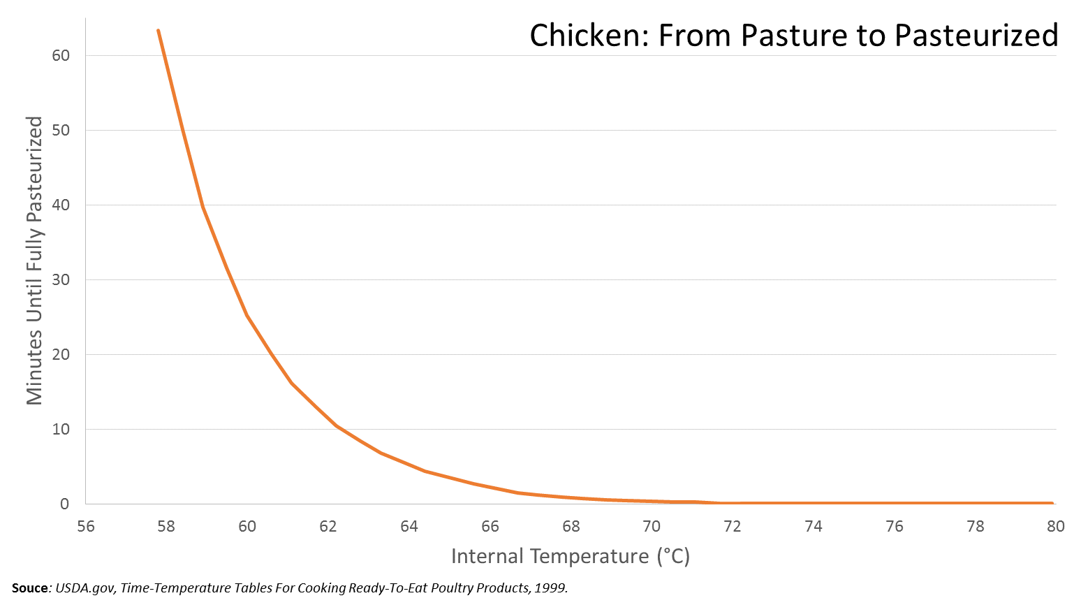 First, it’s important to realize that the USDA’s recommendation is intended to be a one size fits all temperature to ensure literally no one with a normal immune system gets sick ever. They do this by publicizing the temperature that kills all bacteria in any poultry product in an instant (or more precisely, reduces the level of bacteria below a certain safe threshold concentration). But, as it turns out, you can kill just as much bacteria in an instant at 74 °C as you can in about 30 minutes at 60 °C. Chicken pasteurization happens on a curve and our friends at the USDA have published data which describes this curve: