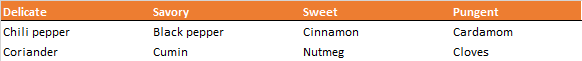 As a matter of brief background, spice blending breaks down into the flavor interactions between categories of spices, what I refer to as delicate, savory, sweet and pungent spices. The following chart best illustrates these interactions: